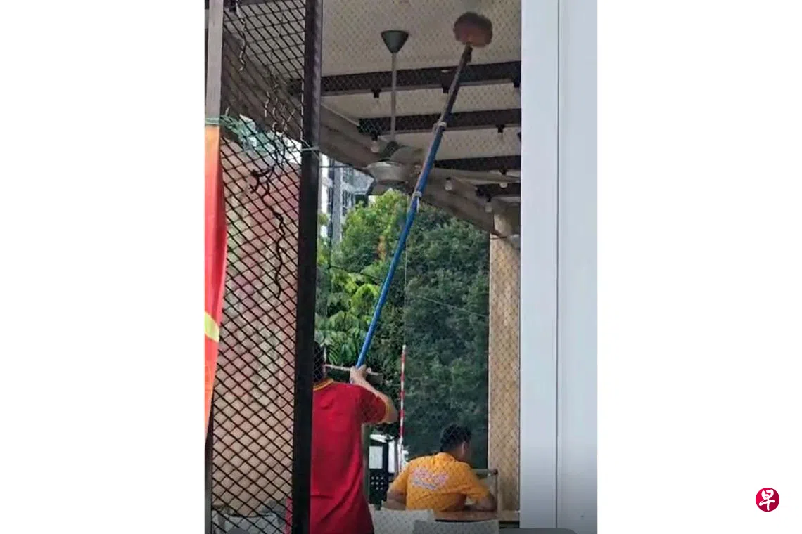 这起事件发生在义顺51街第504座组屋楼下的咖啡店。食客朱源明(61岁,德士司机)申诉,他上星期六(11月23日)下午约3时到咖啡店用餐,看见一名员工举起扫把打扫天花板,灰尘纷纷落下来。
