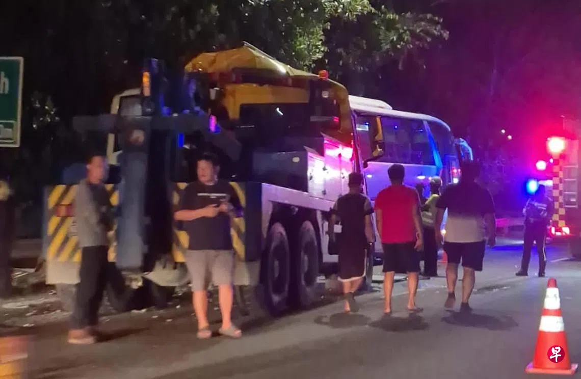 私人巴士与拖车在泛岛快速公路上发生车祸,61岁男乘客送院,其他六名乘客受轻伤。