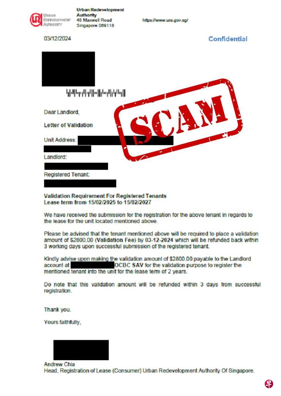 当局指出,信件内有市建局的标志、办公室地址和网址,并由一名自称“租赁登记(消费者)主管”(Head, Registration of Lease (Consumer))的职员“Andrew Chia”签署。