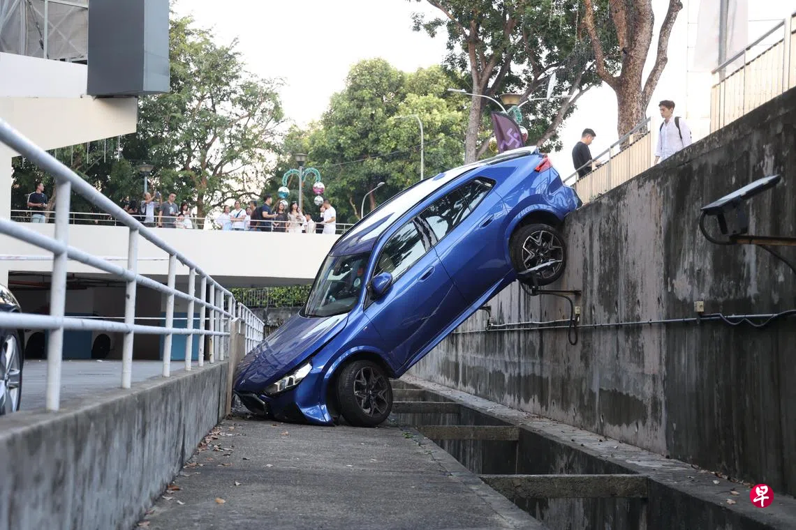 这起事故发生在星期六(12月7日)下午4时许,地点是女皇道购物中心外的亚历山大路。《联合早报》接获读者通报,指四辆汽车在亚历山大路出事,其中一辆蓝色宝马甚至冲上人行道,撞破路旁的栏杆后,一头栽进约三公尺深的排水沟。
