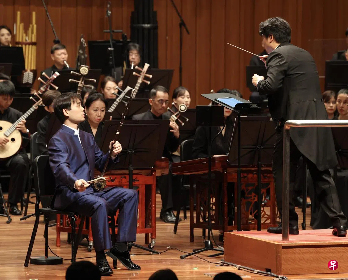 由新加坡华乐团副指挥倪恩辉执棒,卓越组总决赛也是一场高水平的音乐会。柳琴选手于昊沺、沈琦和李轶辰在新加坡华乐团的协奏下先后演奏了《雨后庭院》《如是》《无极》三首协奏曲。
