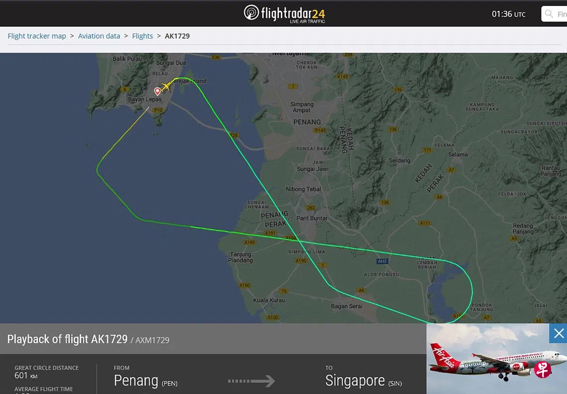 据客机追踪网站FlightRadar资料,班机于星期五晚上9时31分从槟城起飞,飞至霹雳州新邦立马(Simpang Lima)上空后折返并降落。该航班于昨日凌晨5时36分再次起飞,并于早上6时58分着陆新加坡。