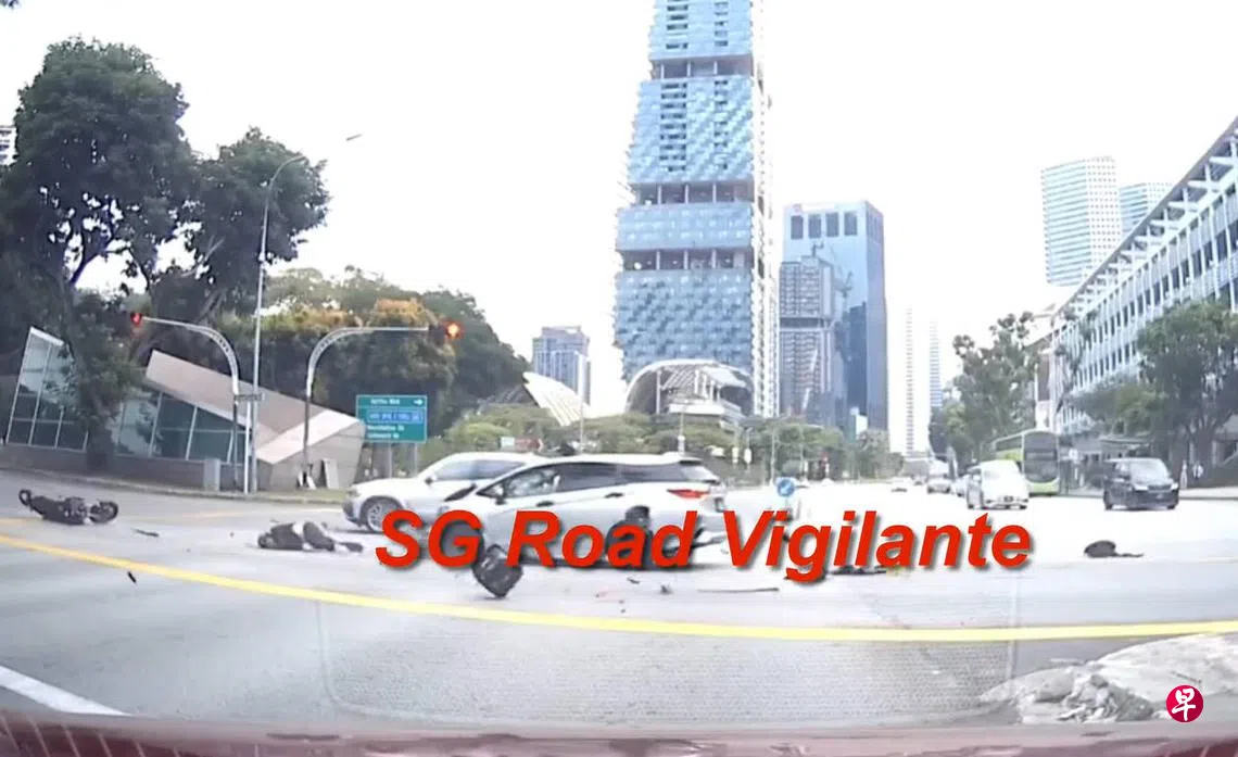 SG Road Vigilante脸书上的视频显示,电单车骑士正驶向路口,突然一辆七人座多用途轿车从电单车的左侧闯红灯驶向路口,与电单车骑士相撞。