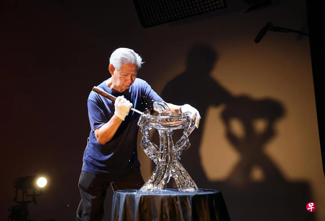 彭泽(68岁)从事冰雕艺术已超过40年,曾代表新加坡到中国哈尔滨、日本等地参加冰雕比赛,为国摘冠。他说,能参与字述一年的揭晓活动,别具意义。气候变化使冰川融化速度加快,也导致极端天气与灾害,以冰雕刻画“灾”字十分贴切。他希望,来年消灾降幅,国泰民安。