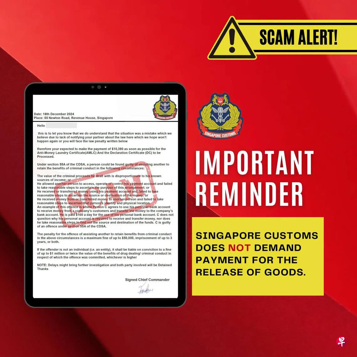 若有疑问,公众可电邮customs_feedback@customs.gov.sg查明真伪。遇到突然索取金钱和个人资料的指示,也应保持警惕,同时向警方通报这类可疑行为。