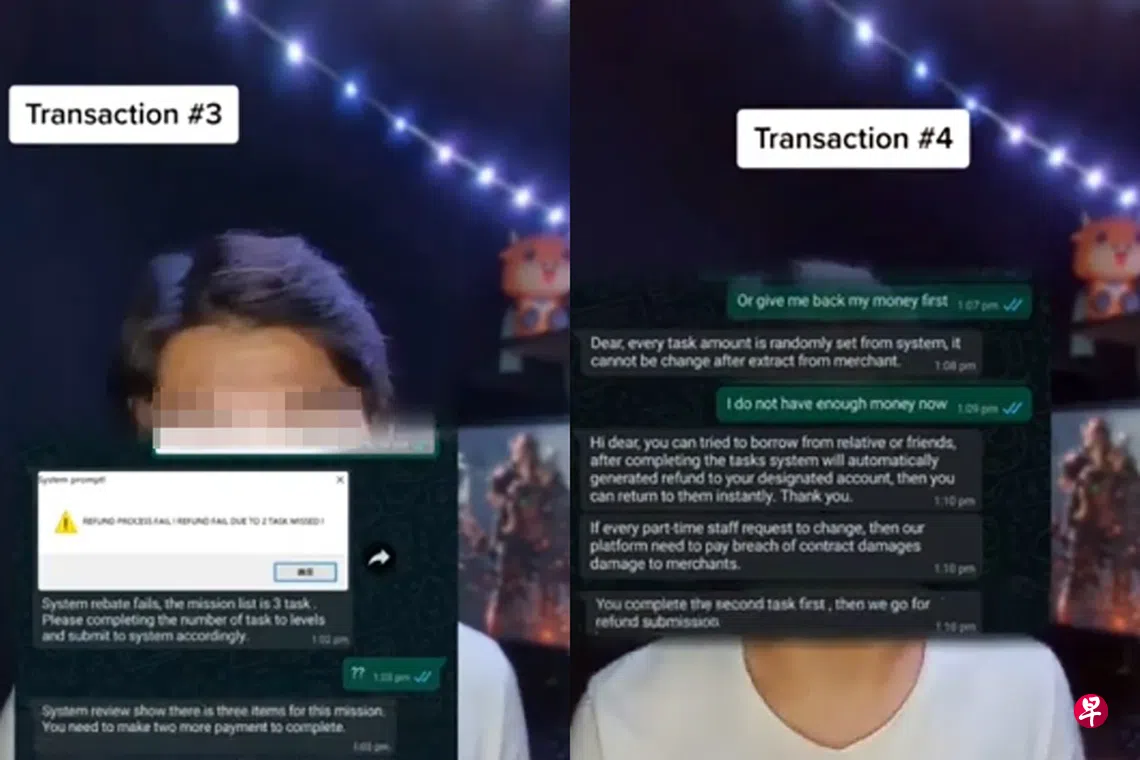 他早前在社交平台TikTok上偶然看到一则居家办公的就业广告。点进去后被带入到一个网页,随后连接上聊天软件对话窗。他通过聊天软件询问,对方称正在为电子商务平台如Shopee和Lazada等聘请“营销员”。