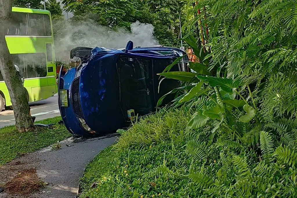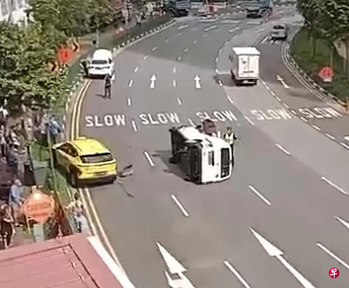 牛车水发生车祸,货车撞上路旁德士后侧翻在地,司机爬窗逃生。