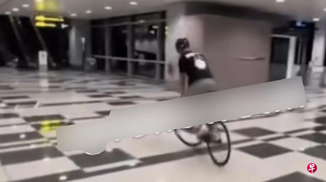 根据社交媒体上发布的一段视频,一名青少年戴着头盔,在搭客大厦内骑脚踏车。随后,画面显示两名辅警与他谈话。