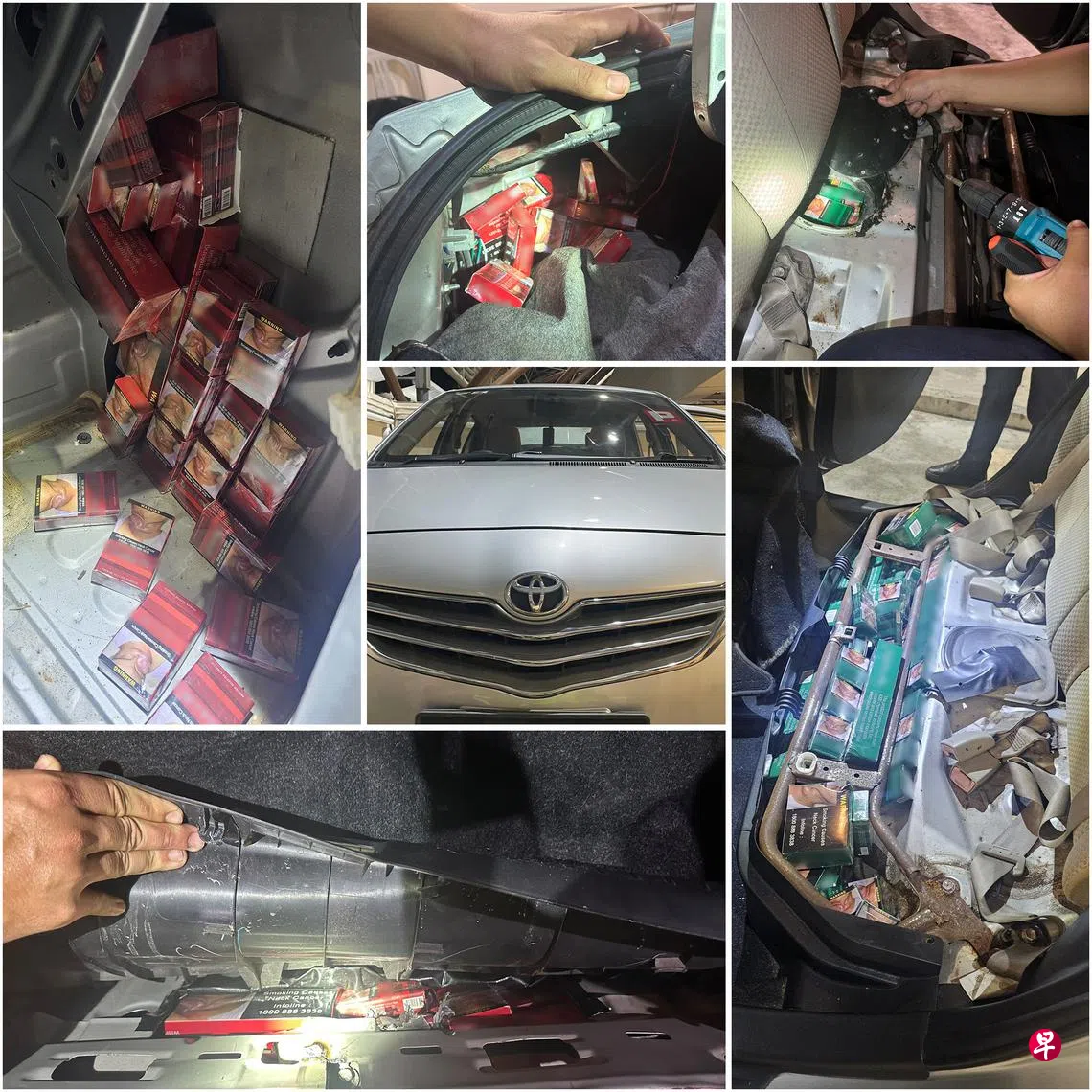 经过一番搜查,移民局人员从汽车不同部位搜出42条和308包散装漏税香烟。根据当局上载的照片,这批香烟被藏在汽车多处,包括改装过的后方座位下,以及后备箱内的暗格。