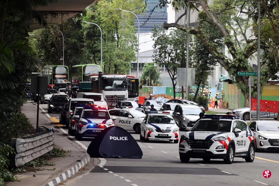 《联合早报》接到读者通报,得知事发路段的天桥下停了不少警车,马路最右边车道有一个蓝色帐篷,路上则有不少鲜血。