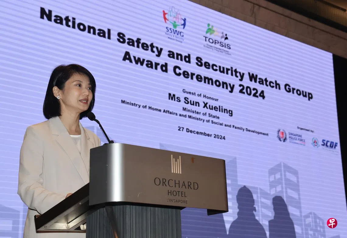 由新加坡警察部队和民防部队联合主办的安全与保安小组(Safety and Security Watch Group,简称SSWG)颁奖礼,星期五(12月27日)在乌节大酒店举行。内政部兼社会及家庭发展部政务部长孙雪玲担任颁奖嘉宾。