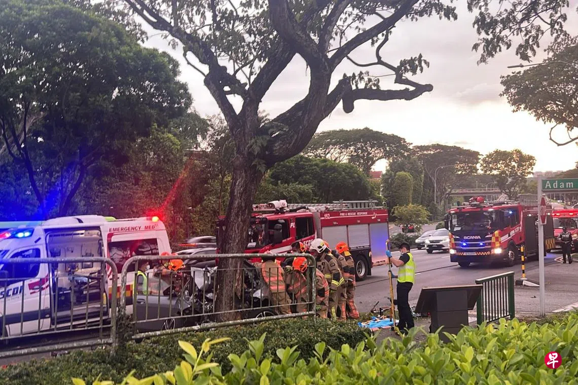 一辆汽车在亚当路行驶时疑似打滑失控冲上路堤撞大树,车内77岁男驾驶员和72岁女乘客不治。