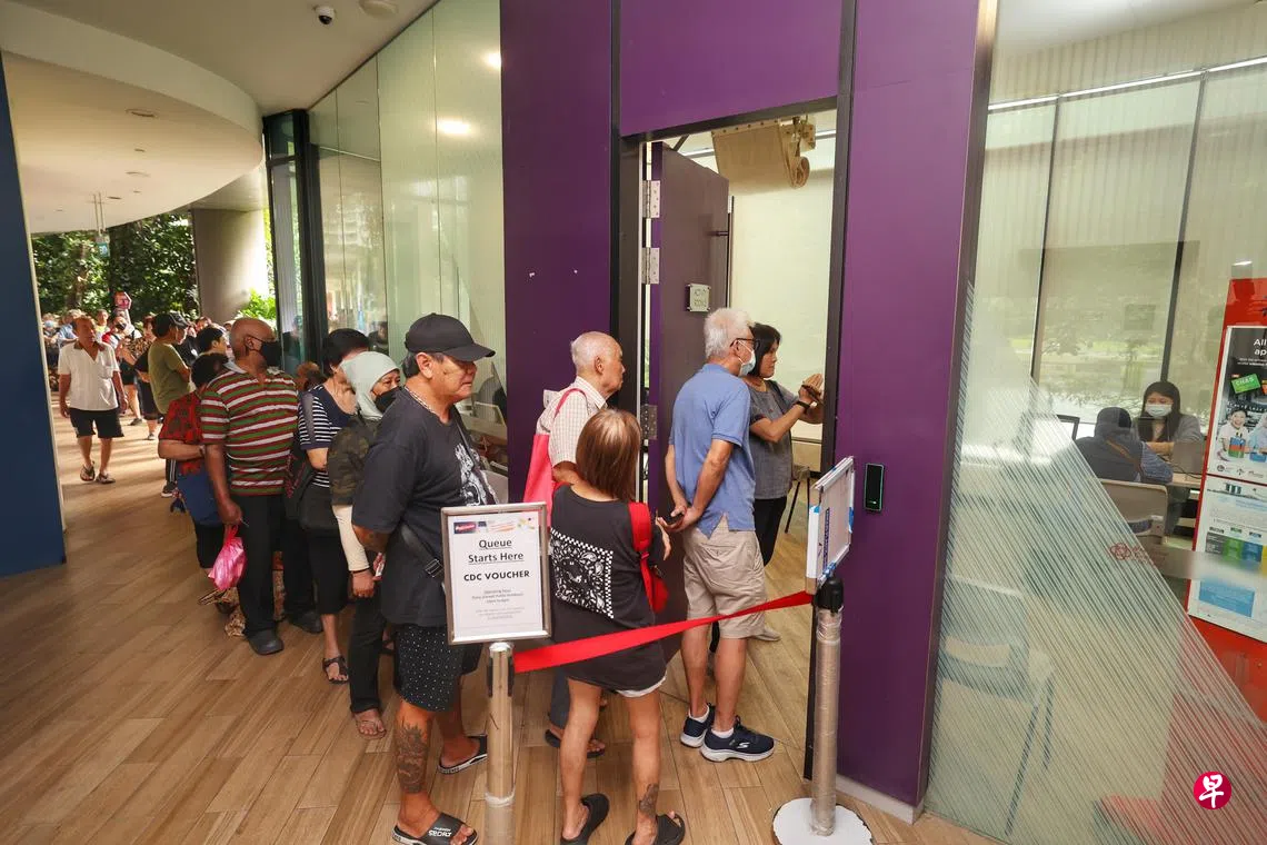 2025年社区发展理事会邻里购物券发放第二天,一些民众俱乐部出现人龙,排队者绝大多数为年长人士。在累积多次管理人潮的经验后,有关单位加派人手和义工协助,多数公众半小时内便领到纸本购物券。
