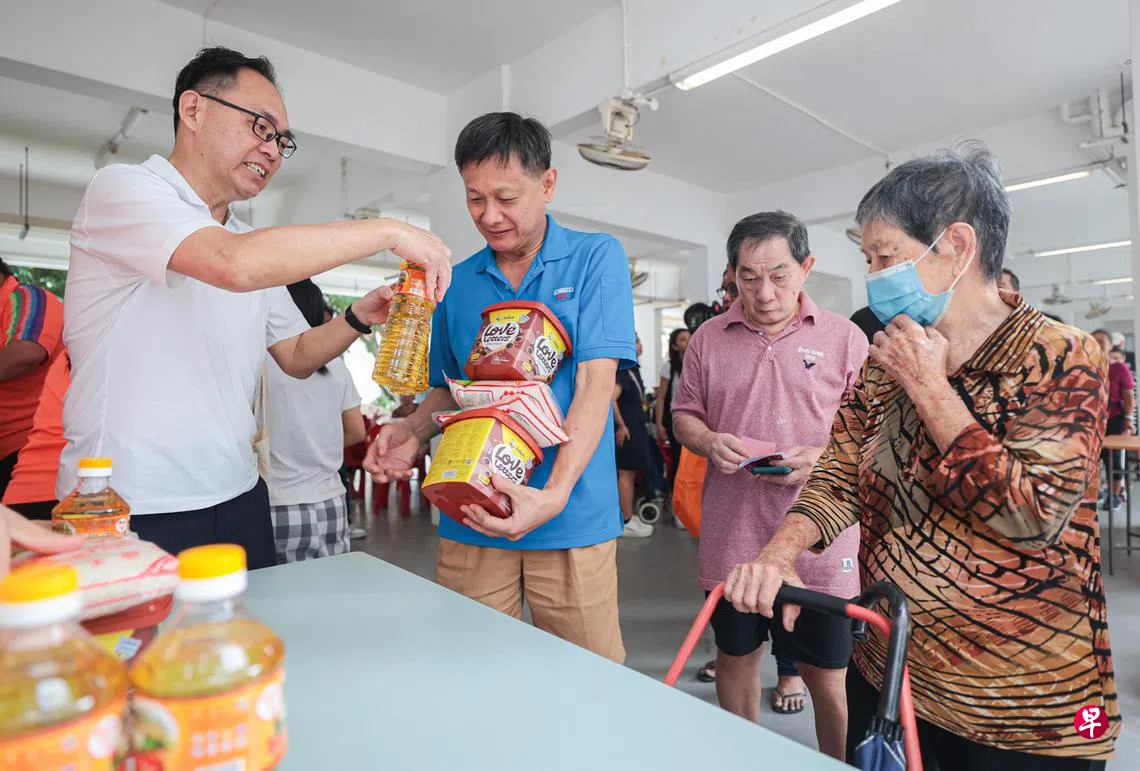 武吉班让基层组织星期天早上准备了1万份1月特价品,预先购买了固本的居民可在区内11个地点凭券领取食油、一公斤白米及一盒蛋卷。现场也为居民准备了叻沙,以及年柑一对,给居民拜个早年。