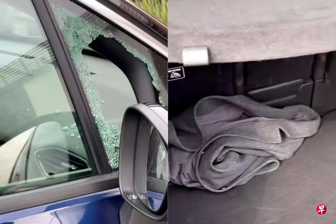 根据视频,副驾驶座一侧的窗口被敲破,玻璃碎片洒入车内,车上留下外套。