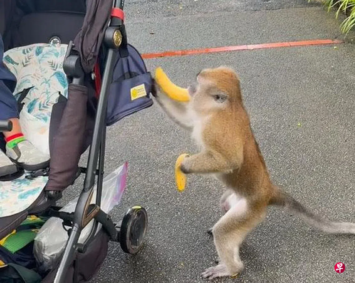 女子到新加坡动物园游玩,遭长尾猕猴“打劫”,抢走挂在婴儿车袋子里的香蕉,她打趣询问猴子“香蕉好不好吃?”