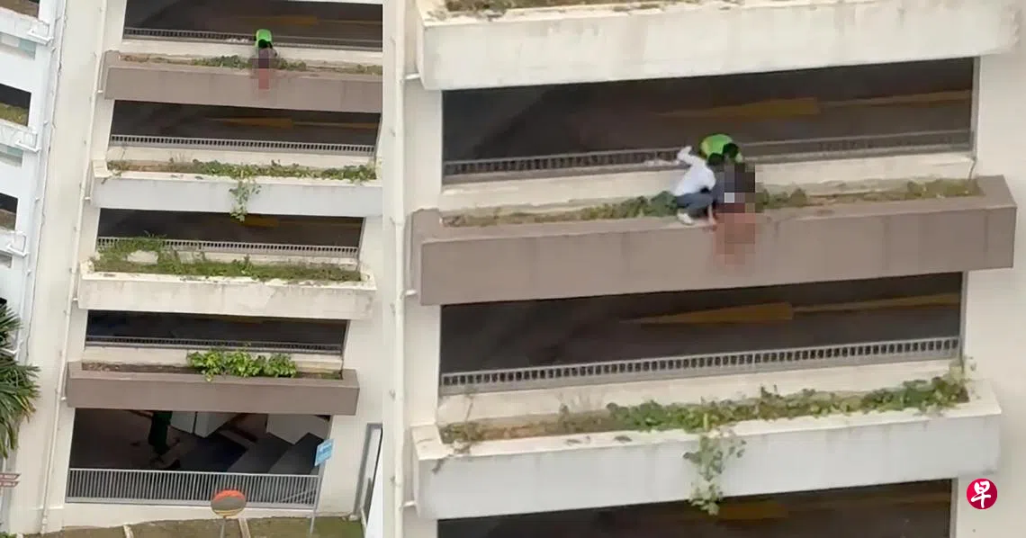 一名身穿绿衣的男子看到后,赶紧趋前用双手环抱少女,试图阻止她往下跳。另一名身穿白衣的男子随后也来帮忙,并跨脚站在墙沿处,与绿衣男子合力将少女拉回停车场内。