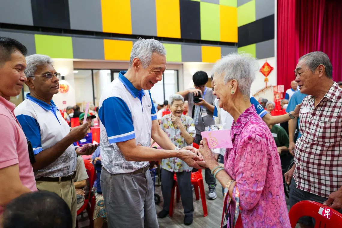 农历新年将至,国务资政李显龙向宏茂桥德义区居民拜早年,分发度岁金给400多名年长居民,并在雨中走访附近巴刹和邻里商店,向公众贺岁。