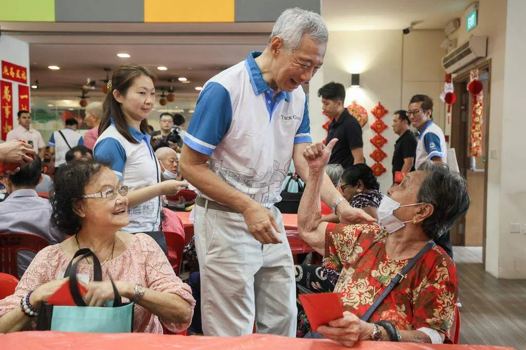 农历新年将至,国务资政李显龙向宏茂桥德义区居民拜早年,分发度岁金给400多名年长居民,并在雨中走访附近巴刹和邻里商店,向公众贺岁。