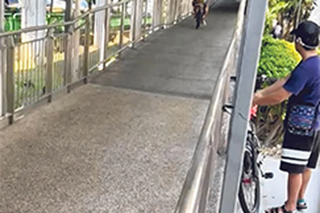 记者走访时发现,天桥没有设置电梯,但有斜坡让轮椅使用者使用。不过,有骑士滥用坡道,违例骑行,直接就骑上斜坡。