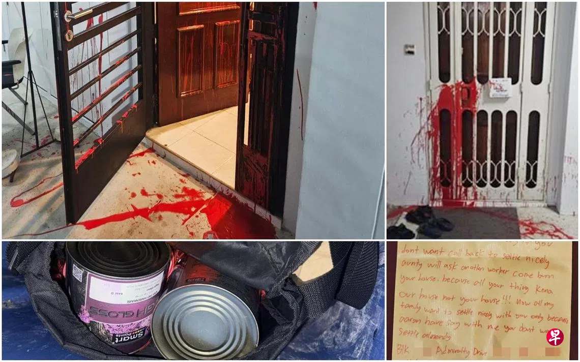 新加坡警察部队星期二(1月14日)发文告说,当局1月12日接获通报,指海军部通道一组屋单位被大耳窿骚扰,门口被泼红漆,还留下一张讨债字条。