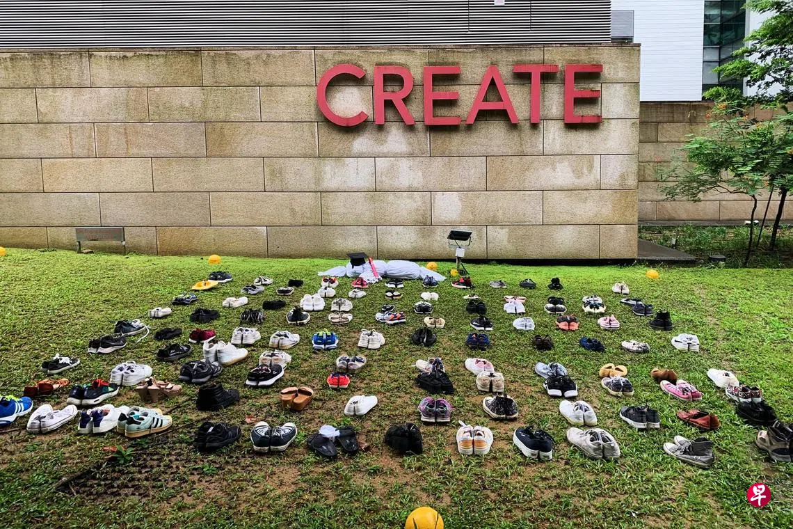 一个声援巴勒斯坦的新加坡学生团体“Students For Palestine Singapore”星期一(1月13日)在国大一栋研究中心外的草地,摆放124双鞋子和一块白色裹尸布,声称为了悼念和缅怀在以哈冲突中丧生的巴勒斯坦学生,同时抗议学校与以色列机构在学术上有合作关系。