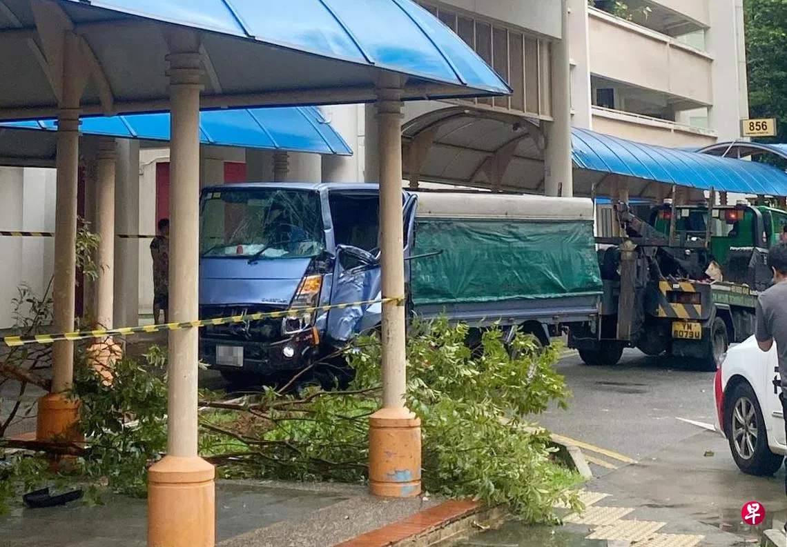一辆罗厘疑因为打滑失控冲上组屋走道,撞上柱子后,还撞倒了一棵树,所幸无人受伤,40岁司机正在协助警方调查。