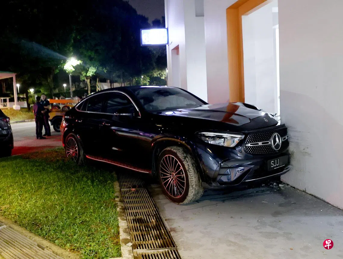 一辆马赛地轿车打滑失控,冲向组屋走道撞上柱子,涉事的79岁驾驶,协助警方调查。