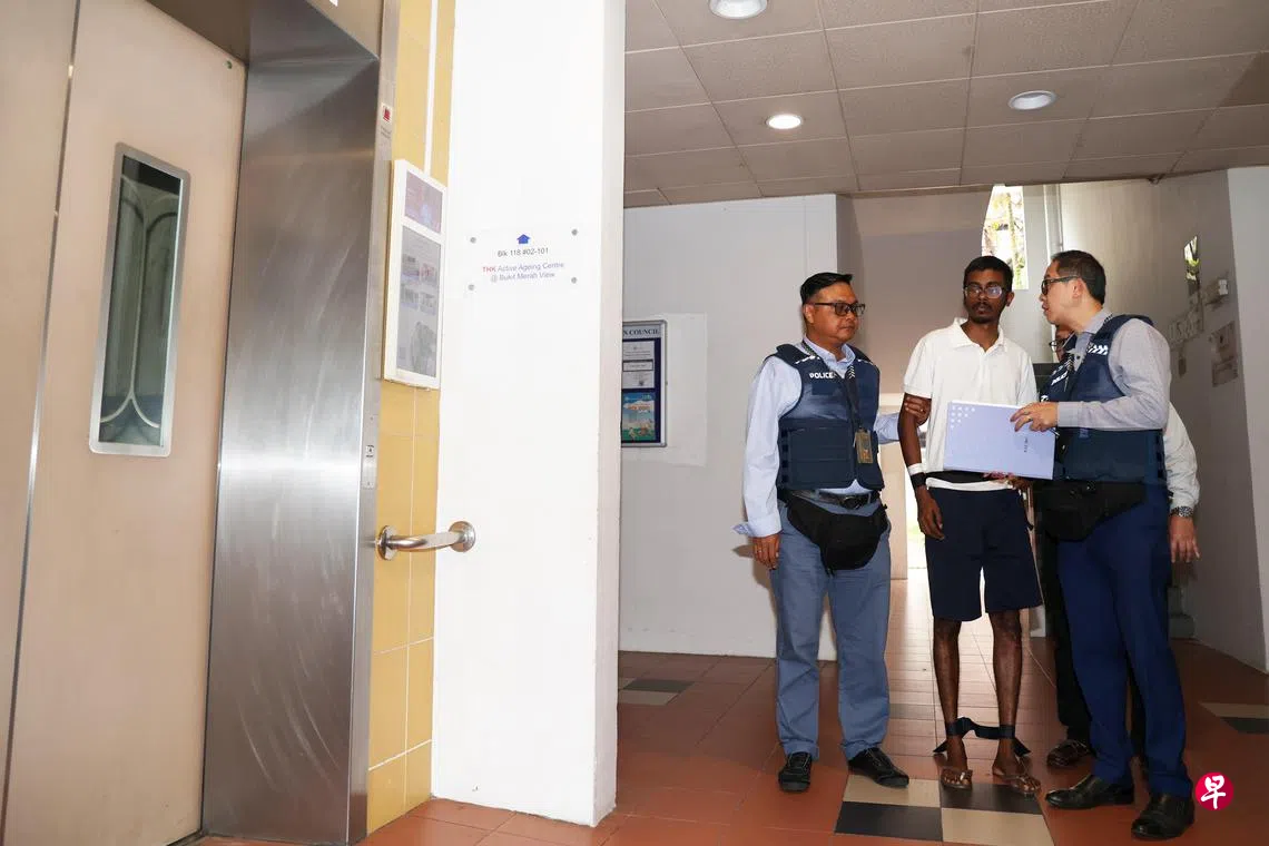 被告抵达现场后低着头神情严肃,警员主要在组屋的电梯口附近停留,被告悉数回答警方的问话,逗留约五分钟后,警员将被告押回警车内离开现场。
