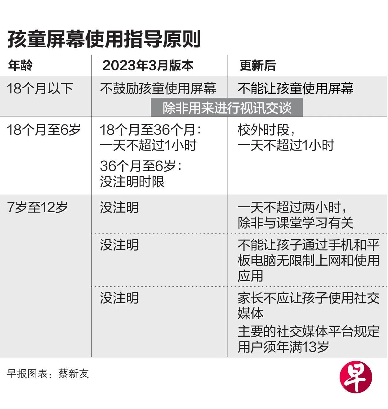 更新后的孩童屏幕使用指导原则,主要调整包括:明文建议三岁至六岁孩童,使用电脑和手机等的时间,每天在校外不应超过一小时;7岁至12岁孩童每天使用时长不超过两小时,除非与课堂学习有关。