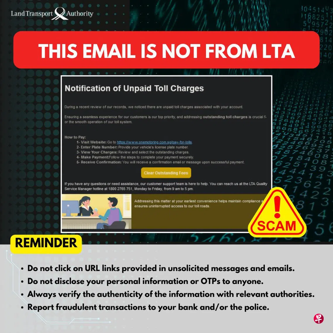 陆交局提醒公众,切勿点击陌生的短信和电邮中的链接,也不要向任何人透露个人信息或一次性密码(OTP)。公众也可向有关当局核实信息真伪,并向银行或警方通报欺诈交易。