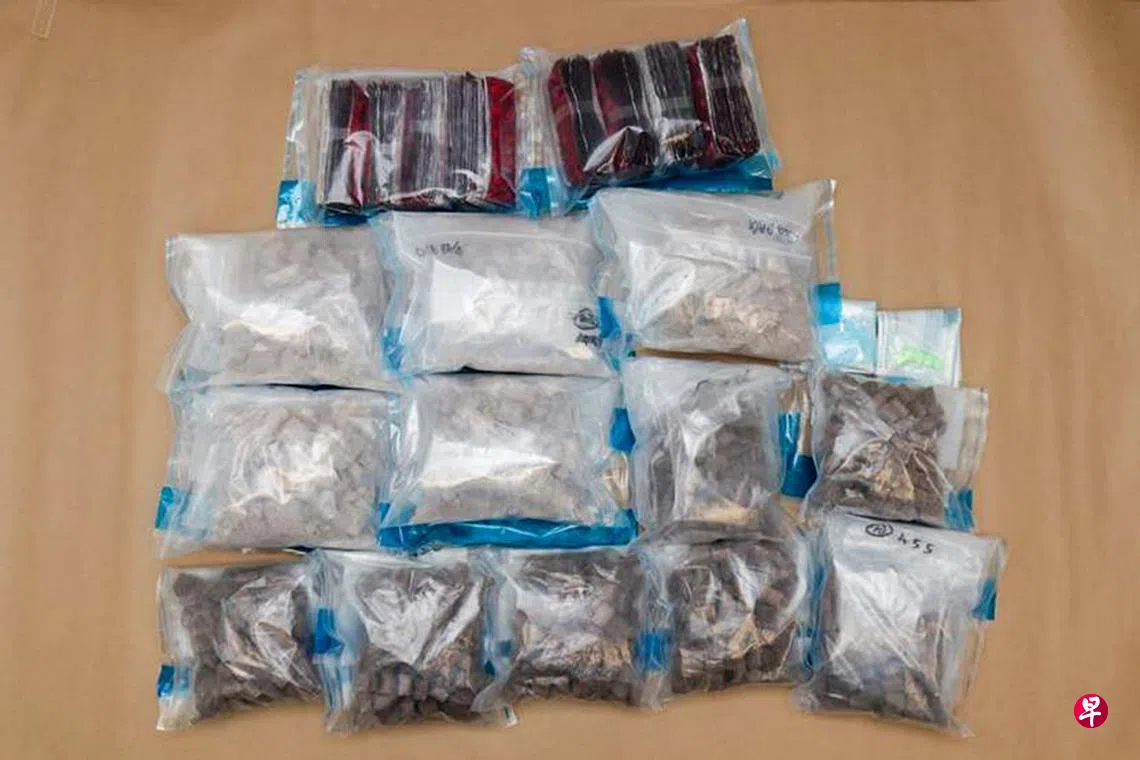 这些包裹疑装有毒品,涉案58岁新加坡男子因此当场被捕,案件之后交由肃毒局作进一步调查。肃毒局共起获约5653克海洛英、14克冰毒、11克爱它死药丸(俗称摇头丸)和2000颗艾利敏5号药丸。