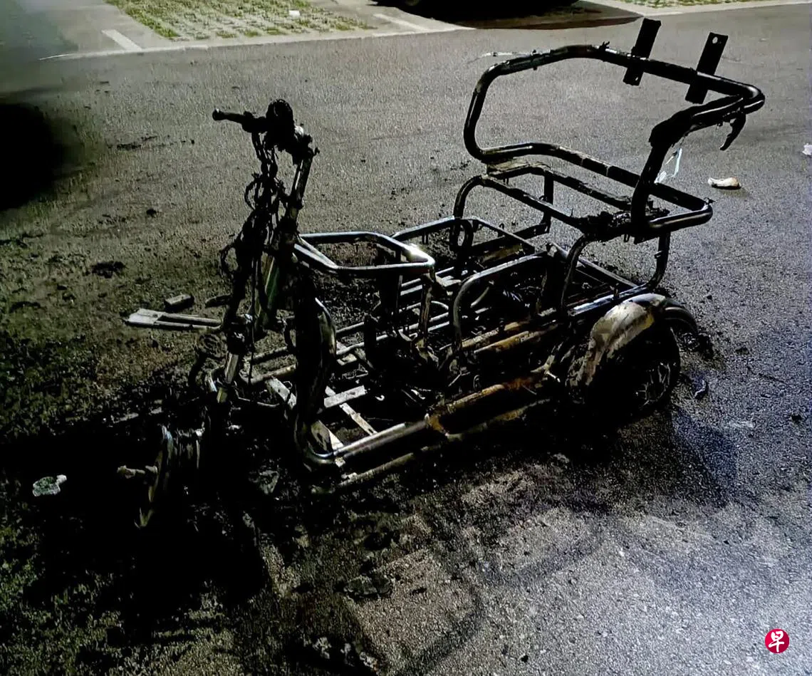 山水·卡玛尔说,事发前一对夫妇骑着一辆行动辅助工具(PMA)送外卖,行至事发地点时突然闻到一股异味,察觉到情况不妙的两人迅速取下备用电池并撤离。就在两人下车不久后,车子就开始起火燃烧。