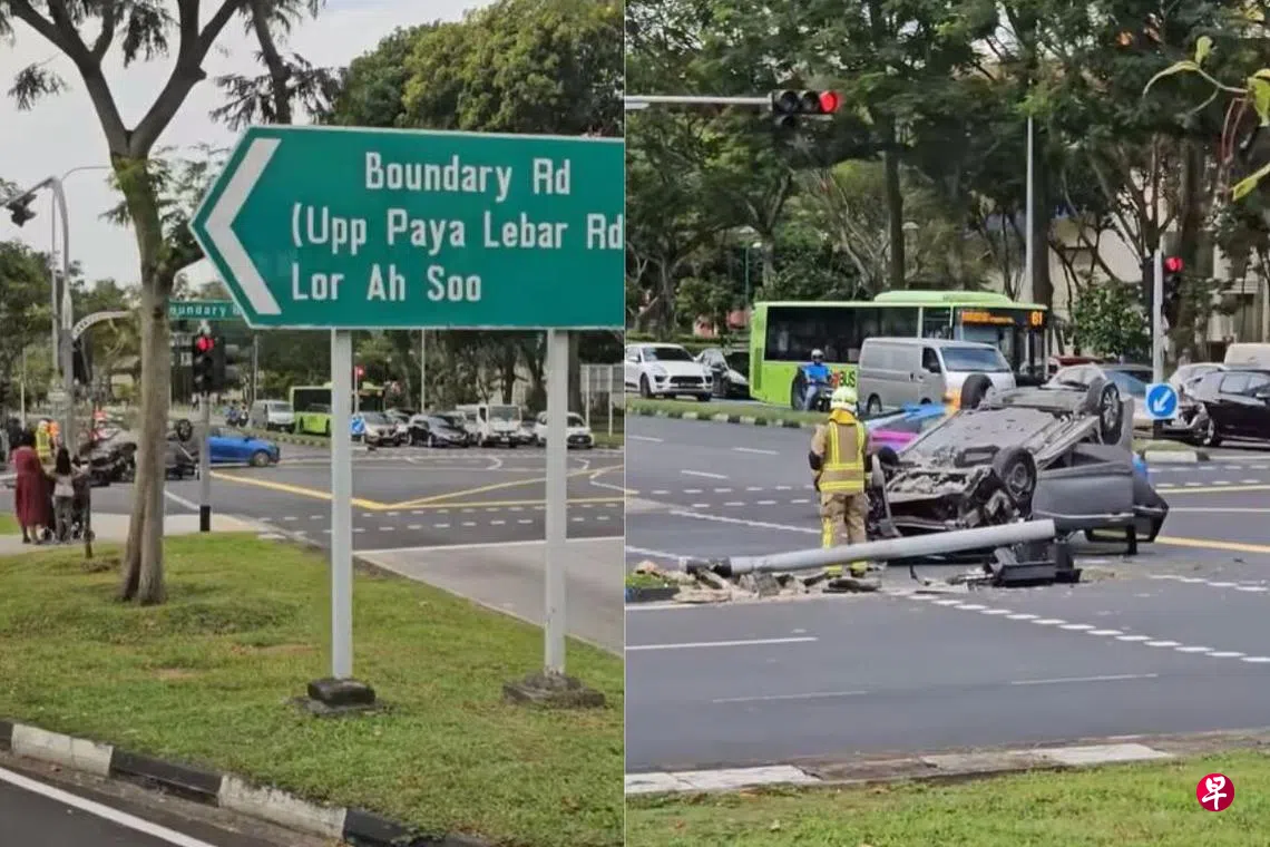 根据社交媒体流传的画面,一辆汽车车轮朝天在交界处翻覆,附近一个交通灯遭撞毁后倒下,现场来了不少警员和民防部队人员。