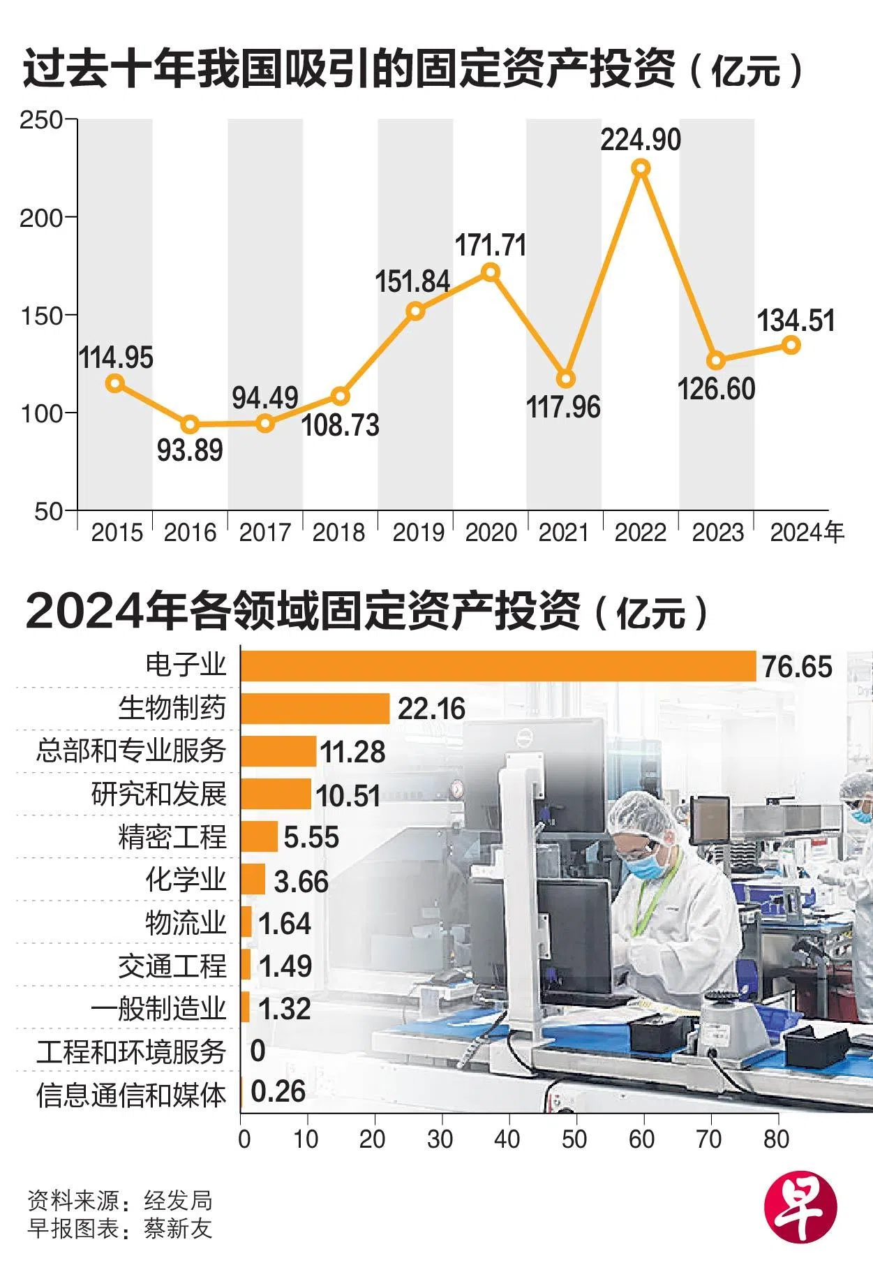 去年,电子业吸引到最多固定资产投资,投资额为76亿6500万元,占57%;吸引第二多的是生物医疗制造业,固定资产投资额为22亿1600万元,占16.5%;排第三的是总部和专业服务,投资额为11亿2800万元,占8.4%。