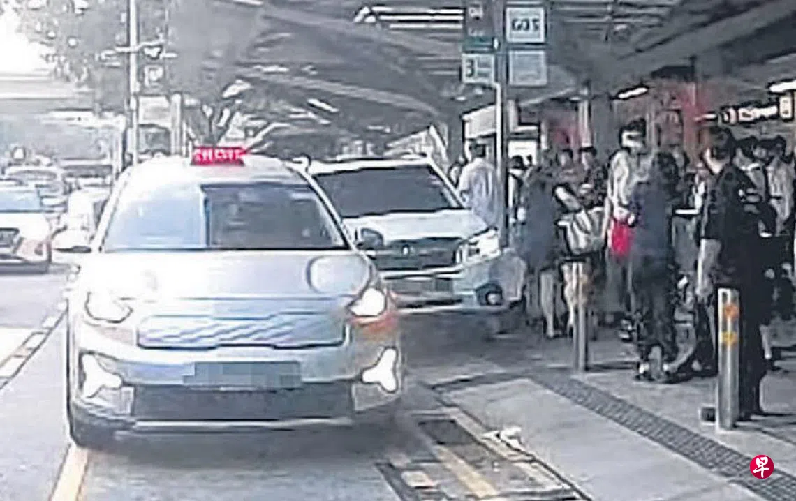 一辆汽车失控冲入德士站,撞上前方德士并撞飞三名路人,所幸防撞柱和德士站牌柱子挡住,才没撞进人群。