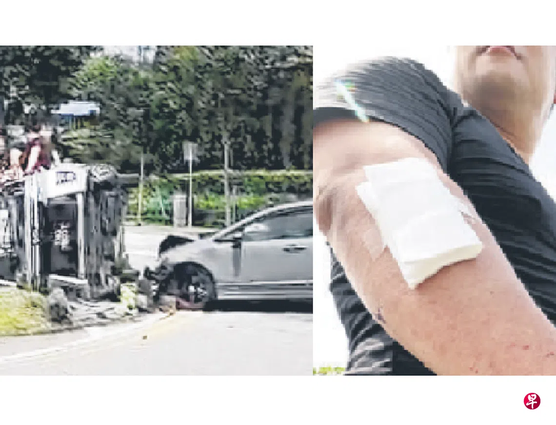 车祸导致他手臂擦伤,但无大碍,不禁感叹命大。拖车在下午3时左右,先后将涉事车辆拖走,当时另一驾驶员已经离开现场,车祸也没造成交通拥堵。