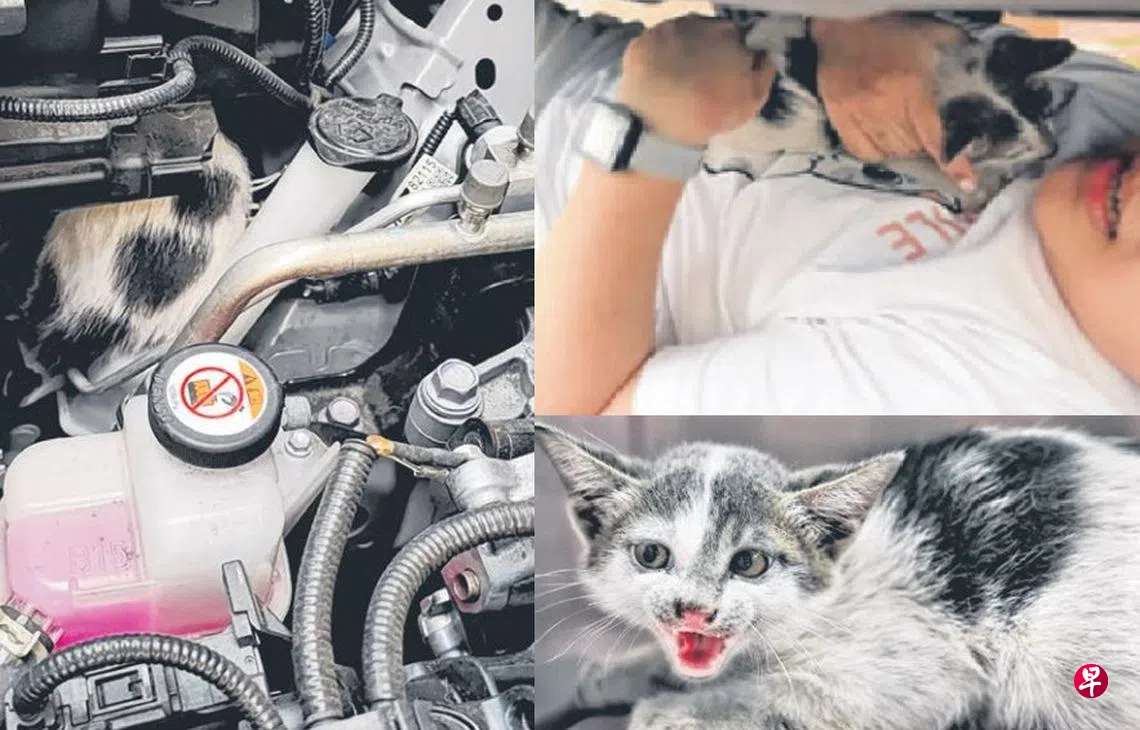 “我们打开引擎盖,看到里面有一只黑白相间的小猫躲在引擎里面,怎么叫它都不出来。”