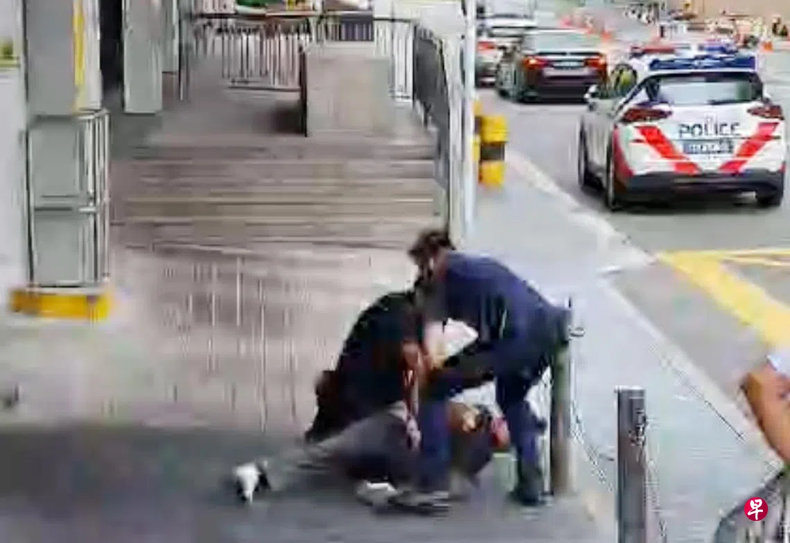 事后,两名警员合力将男子按倒在地上,将他的双手压制在背后再上铐。