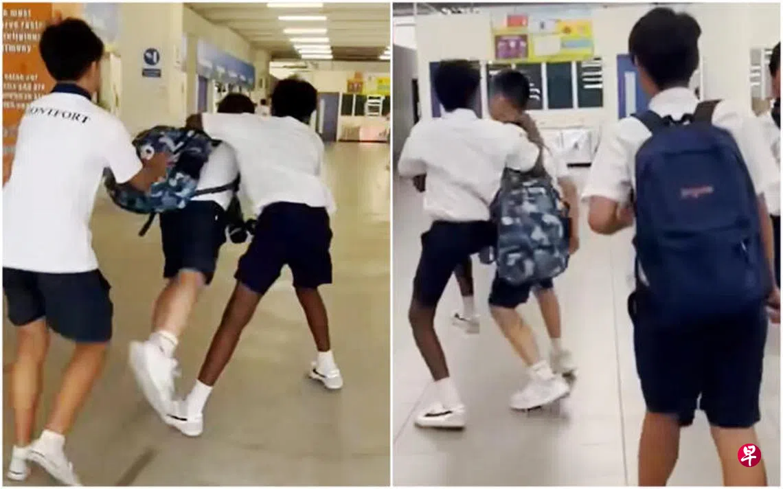 社交媒体日前流传一段视频,显示两名穿着后港蒙福中学(Montfort Secondary School)校服的男学生,在哄闹中跑向学校食堂,多次绊倒、推搡和踢踹一名男同学。视频在广泛流传后引起网民议论。