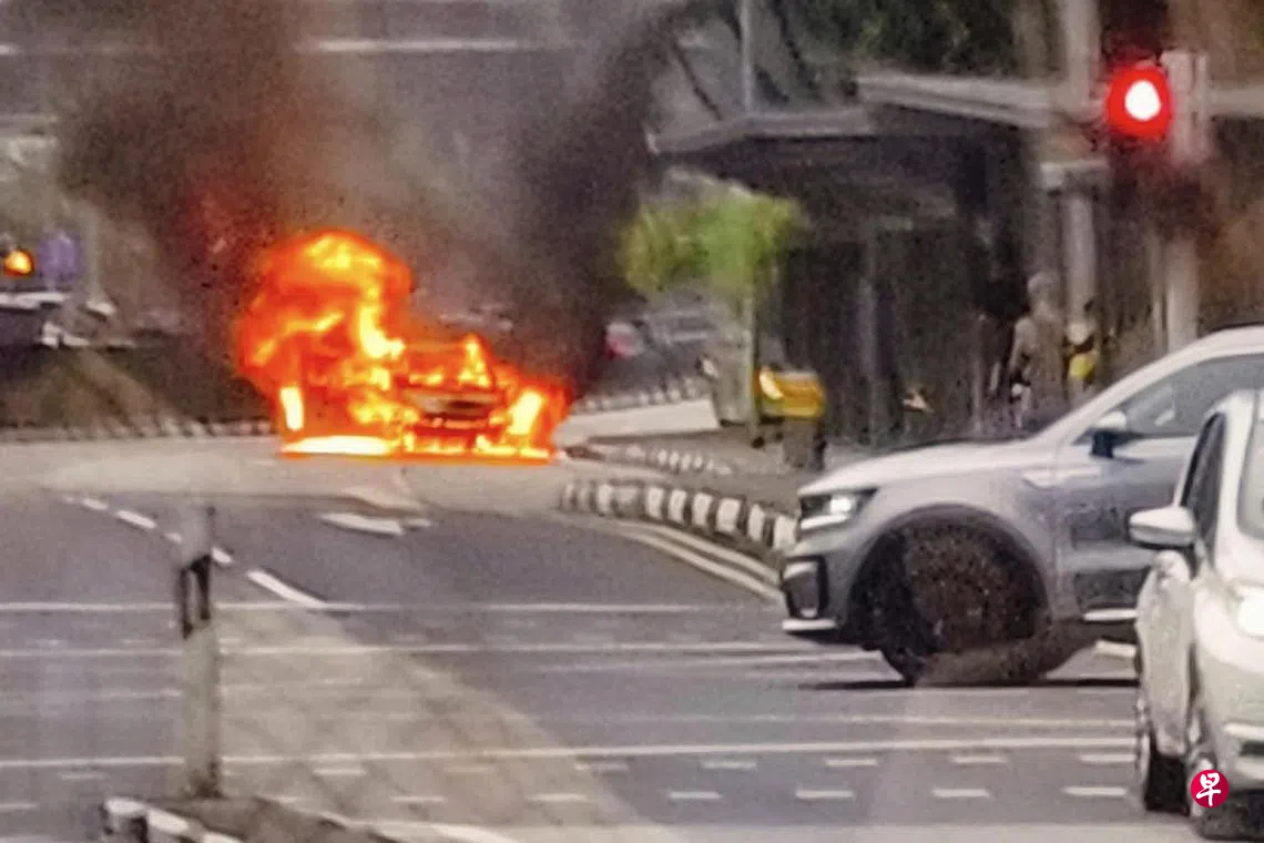 一辆汽车在裕廊西路边冒起熊熊烈火,消防员将大火扑灭,无人受伤。