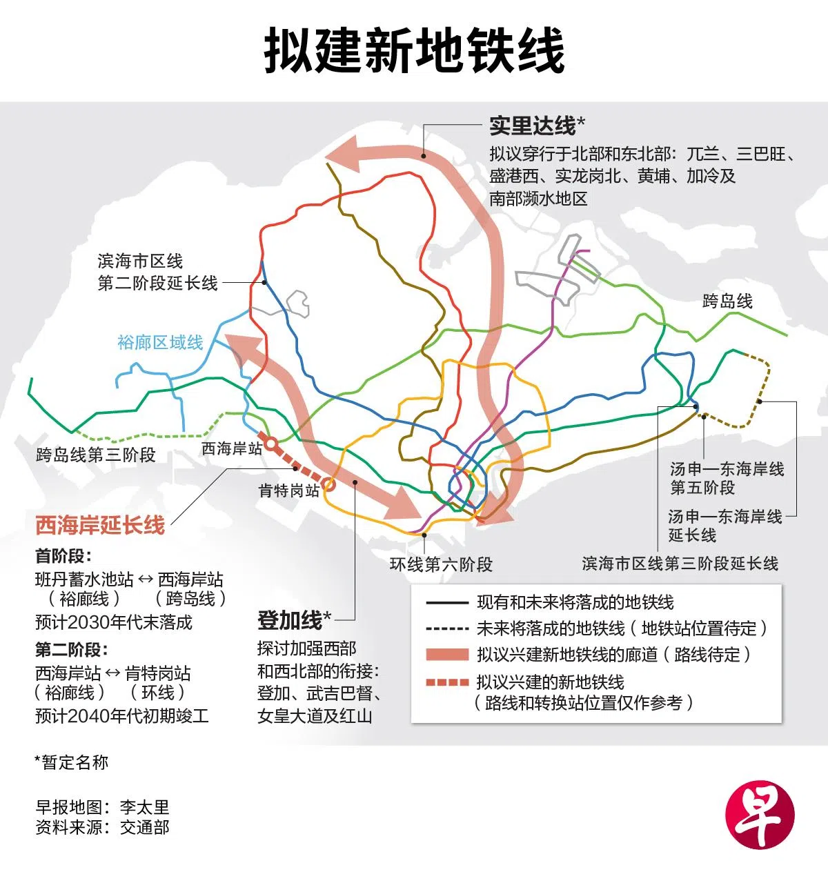 政府计划分两个阶段兴建西海岸延长线,把裕廊区域线进一步衔接到环线,以加强西部的衔接性;与此同时也在研究建造多两条地铁线,并且有可能在未来重点发展的南部濒水地区交汇,让超过40万户家庭步行10分钟内就能到地铁站。