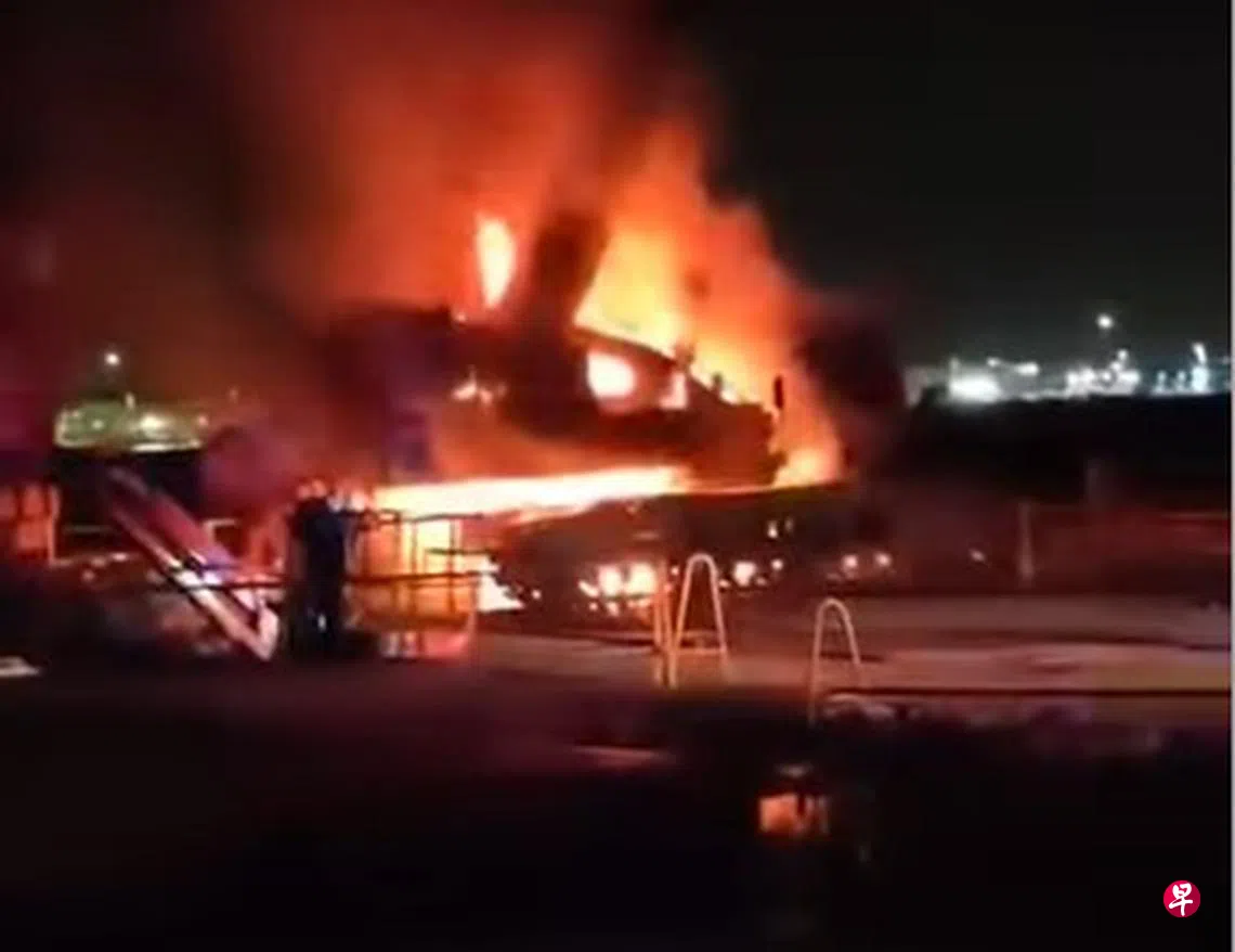 社交媒体脸书星期三(5日)下午流传一段55秒长的视频,可见一个工地内的一辆吊车起火狂烧。