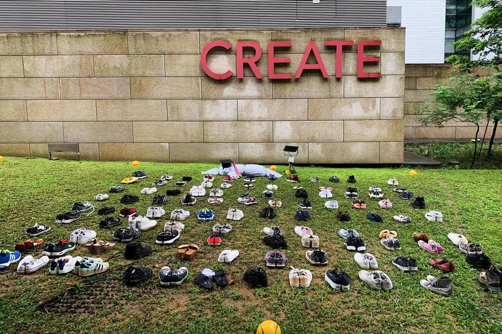 1月13日,一个声援巴勒斯坦的团体“Students For Palestine Singapore”,在新加坡国立大学校园一栋研究中心外的草地,摆放124双鞋子和一块白色裹尸布,声称这是为了悼念和缅怀在以哈冲突中丧生的巴勒斯坦学生,同时抗议学校与以色列机构在学术上有合作关系。