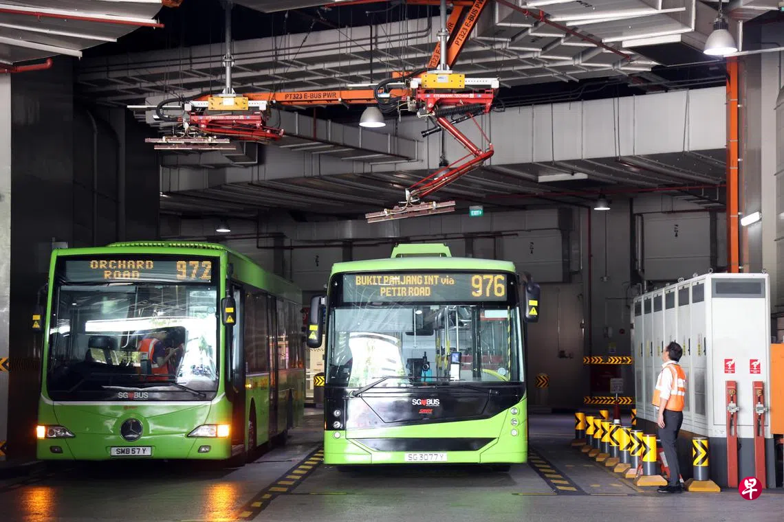 至于电动巴士充电桩,武林、实里达和罗央巴士车厂目前已备有插电式充电桩(plug-in charger),共计42个。武吉班让和勿洛巴士转换站共有四个受电弓(pantograph charger)。新的盛港西巴士车厂也将安装240个更高电力的充电桩。