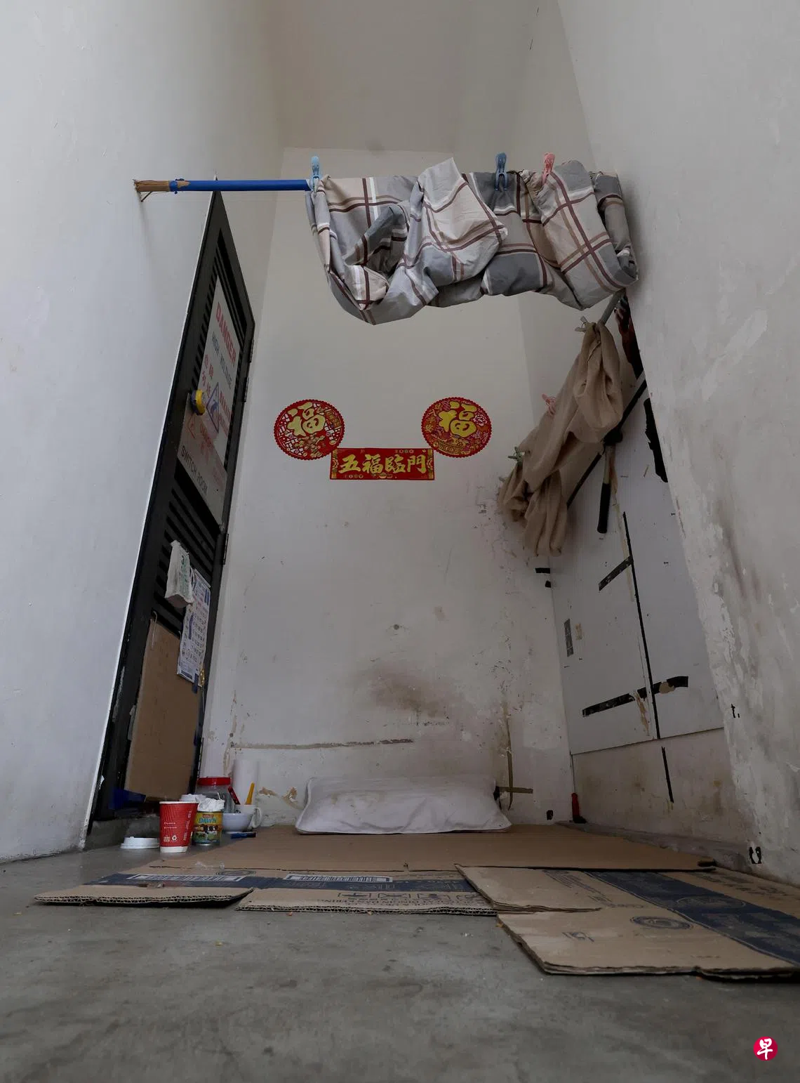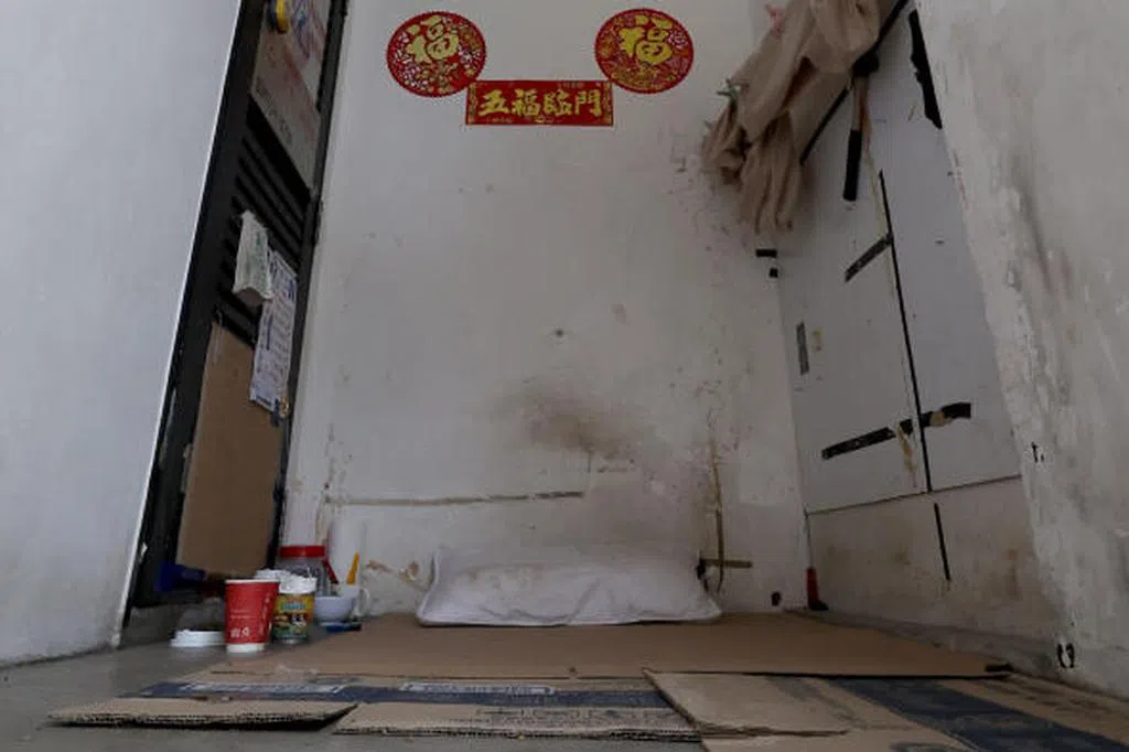 《新明日报》日前报道,一名六旬叔被指在三巴旺威灵顿圈(Wellington Circle)第508座组屋停车场电房旁留宿,除了纸皮床,还有枕头、窗帘,以及日历等生活用品,宛如一个“小房间”。