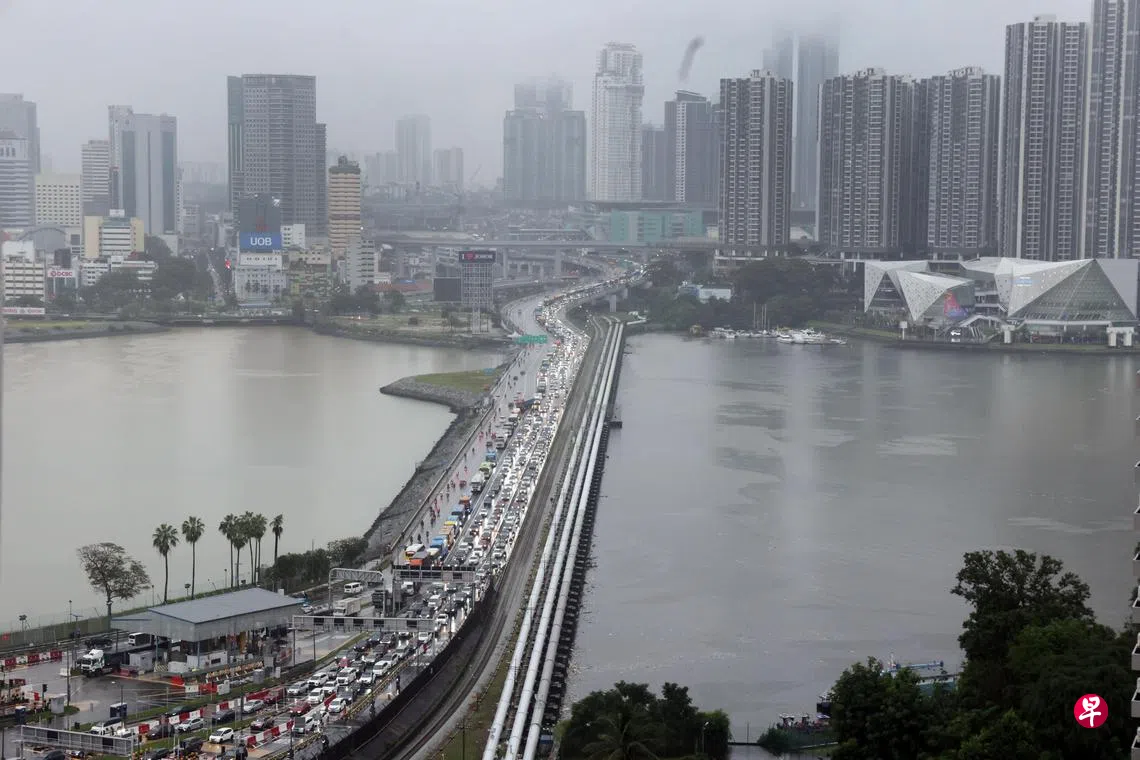 记者星期三晚上7时许到马西岭观察长堤情况,看见从新山入境兀兰的车龙塞满长堤上,还有人撑伞越堤。
