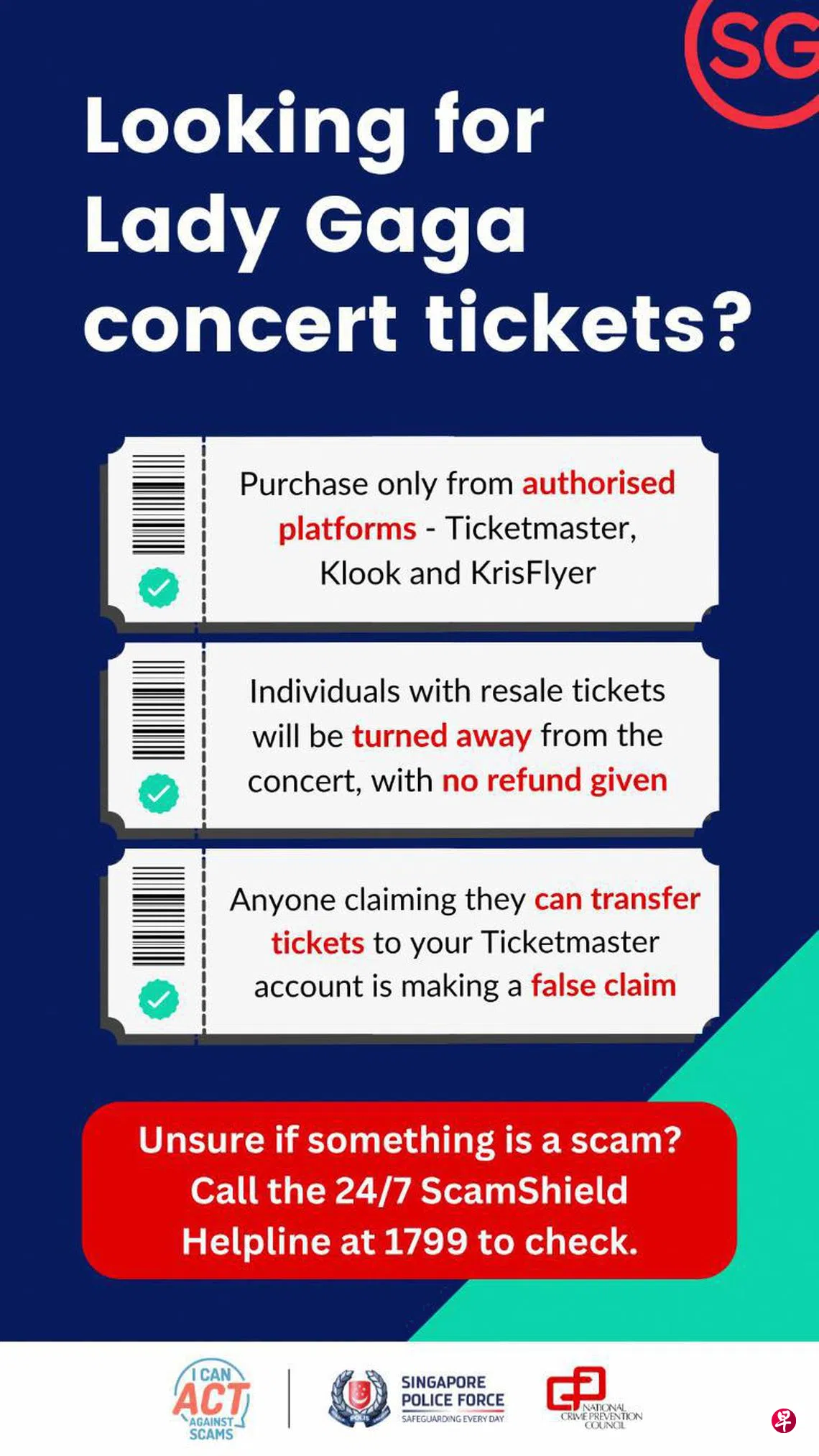 警方提醒,女神卡卡演唱会门票仅可通过Ticketmaster、Klook和KrisFlyer三大官方平台购买。