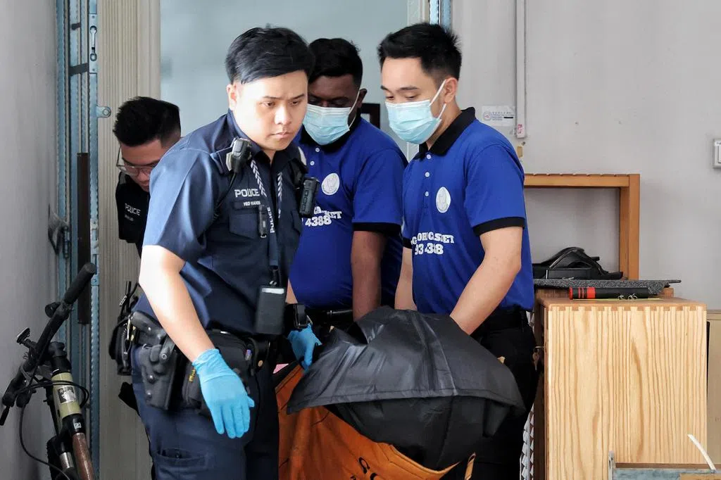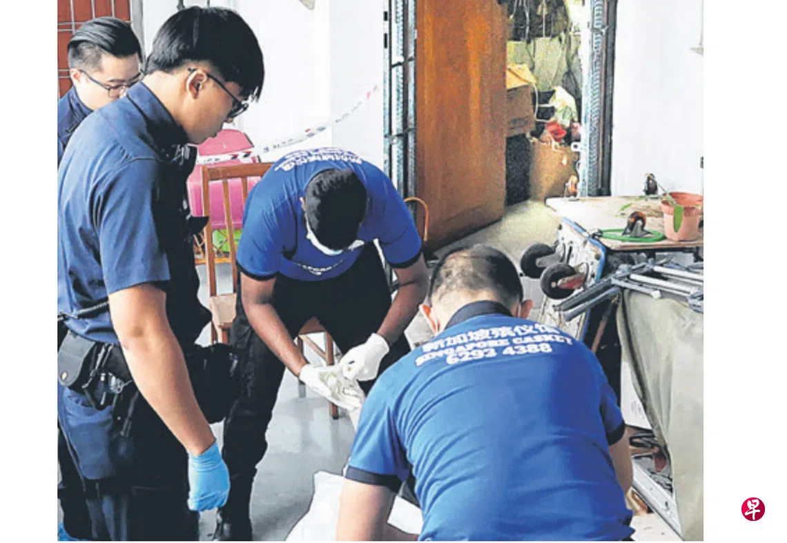 警方结束调查后,仵作上门抬尸,或因杂物太多,遗体必须搬到屋外后才装袋。