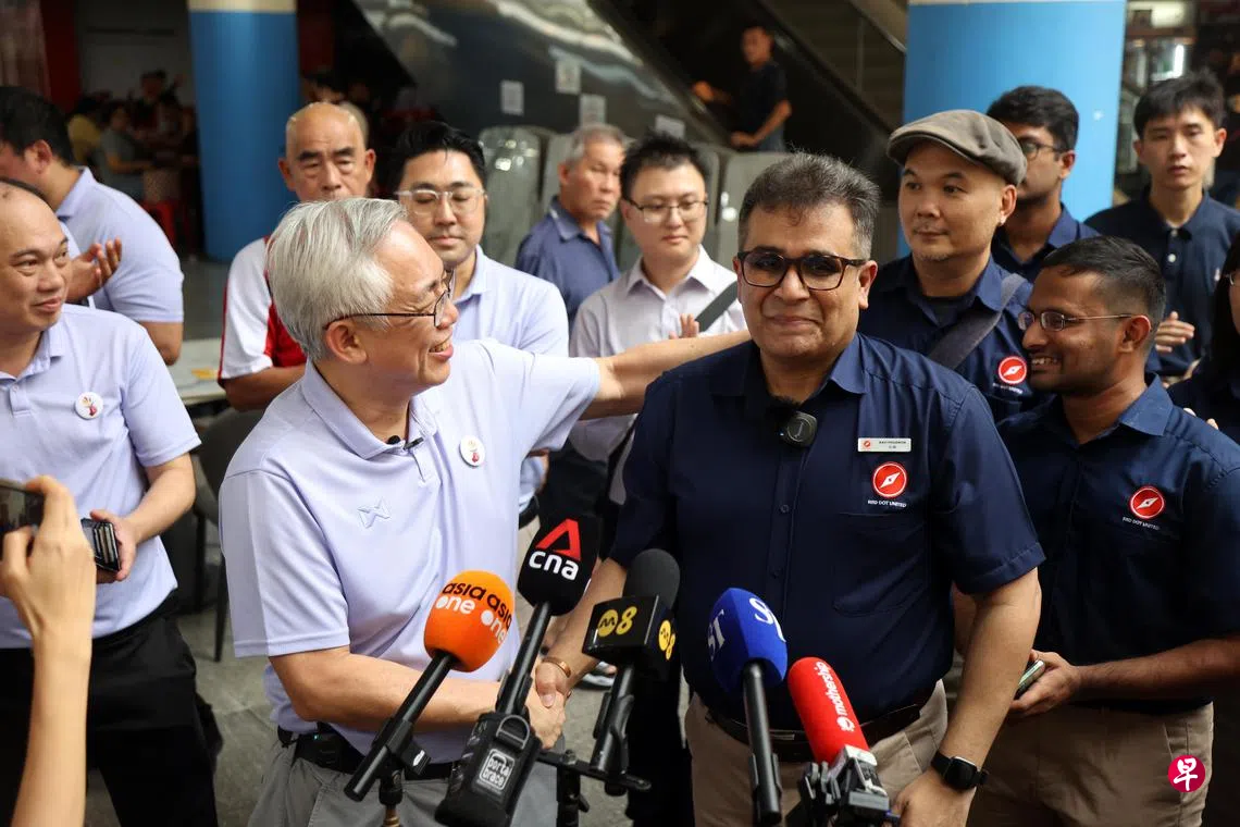三个政党代表相互微笑寒暄,红点同心党的党员也向费绍尔说自己是他的选民。费绍尔也是内政部兼国家发展部政务部长,自2011年起当选义顺集选区议员。